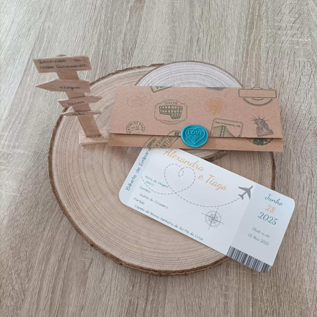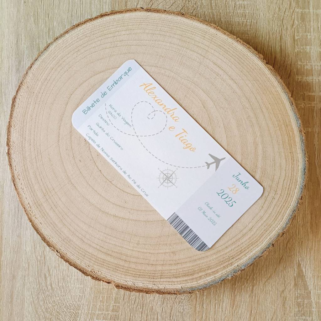 - Design: O convite simula um cartão de embarque real, com cantos arredondados, ícones de aviões, bússolas e um “código de barras”. Impressão em papel de gramagem 220gr com acabamento mate.