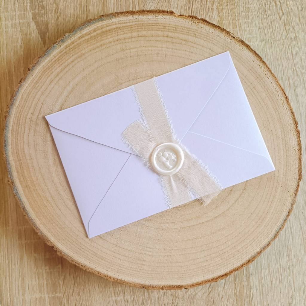 - Acabamento: Fecho com fita Chiffon em tom beige e um selo de lacre branco pérola com um motivo “namorados” em relevo.