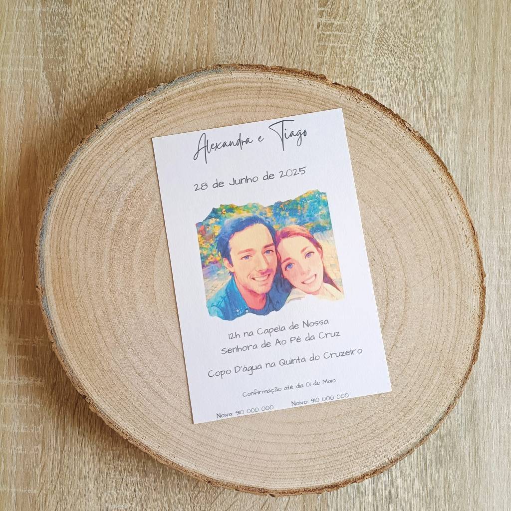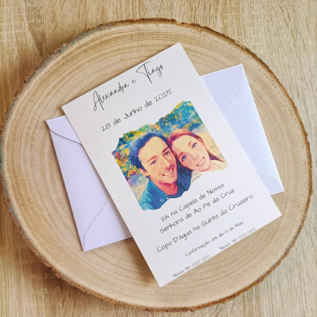 Porque cada história de amor é única, este convite transforma uma fotografia especial do casal numa ilustração artística. É a escolha perfeita para noivos que desejam um convite que seja, simultaneamente, uma recordação afetiva para os seus convidados.