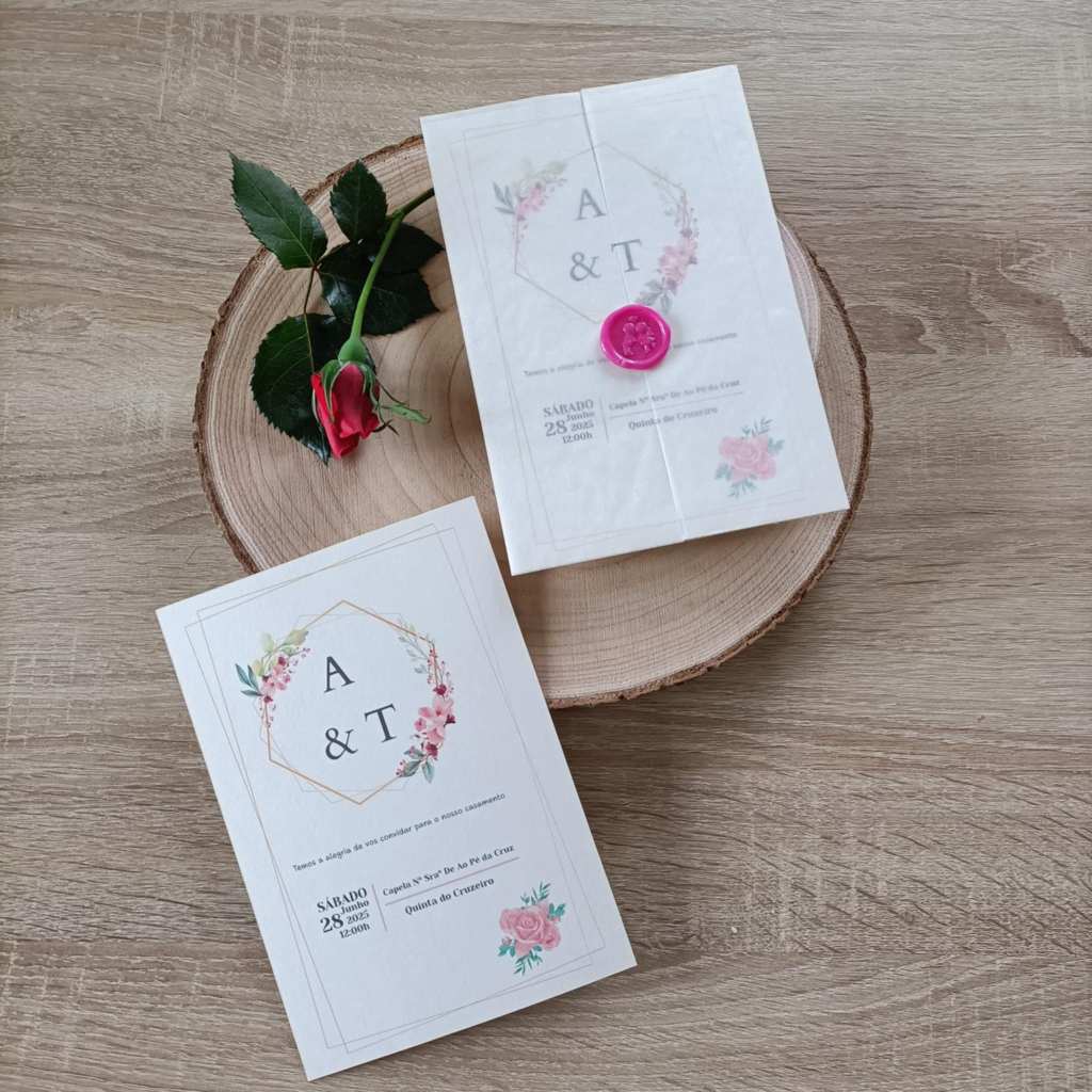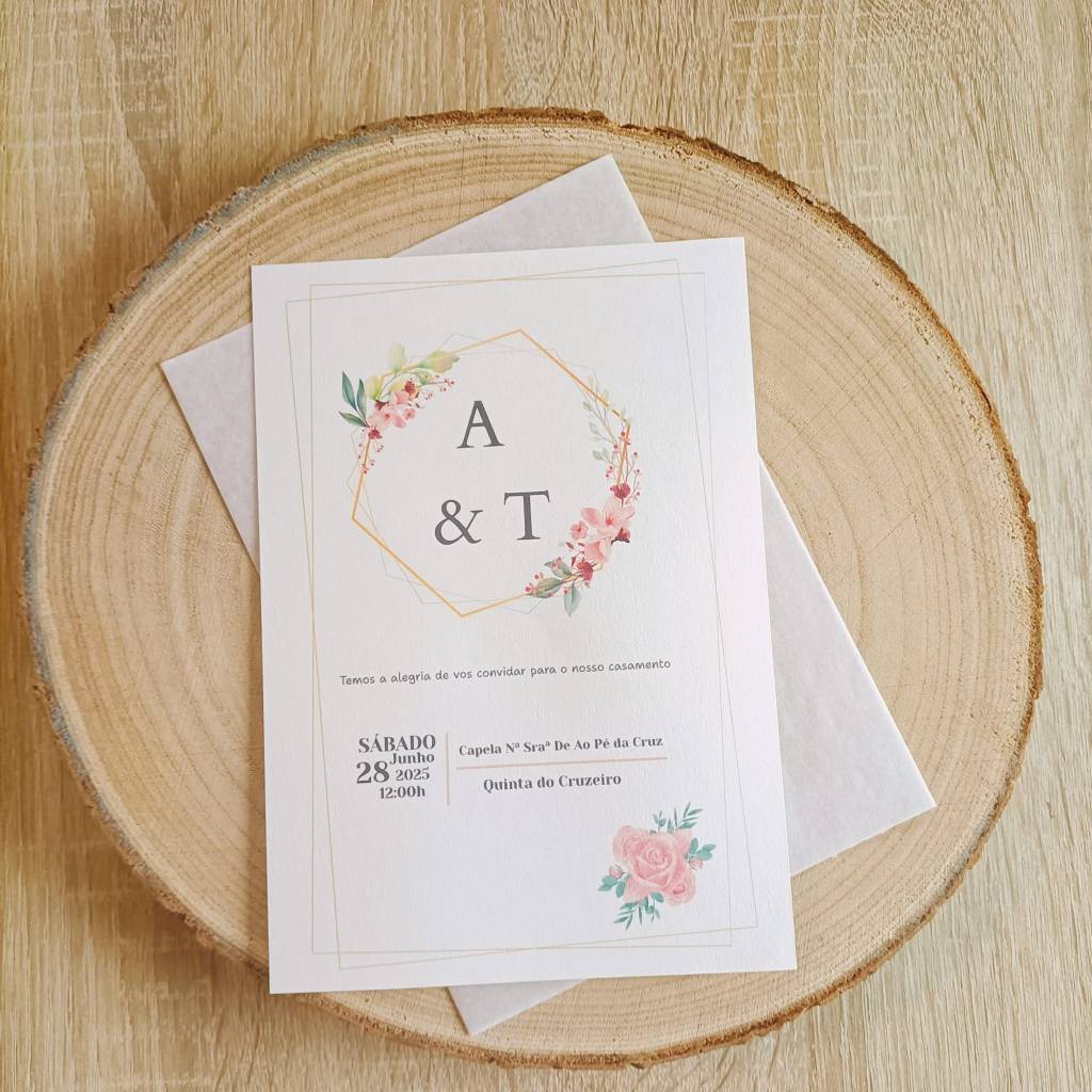 - Design: O monograma dos noivos é emoldurado por um hexágono dourado minimalista, decorado com ilustrações de rosas em tons de rosa e folhagem verde suave. Impressão em papel de elevada gramagem (220gr) com textura suave.