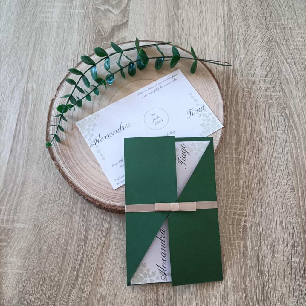 A harmonia perfeita entre o verde profundo da floresta e a elegância do design clássico. O Convite Natural Elegance foi pensado para noivos que desejam anunciar o seu dia com requinte, trazendo um pedaço da natureza para as mãos de cada convidado.
