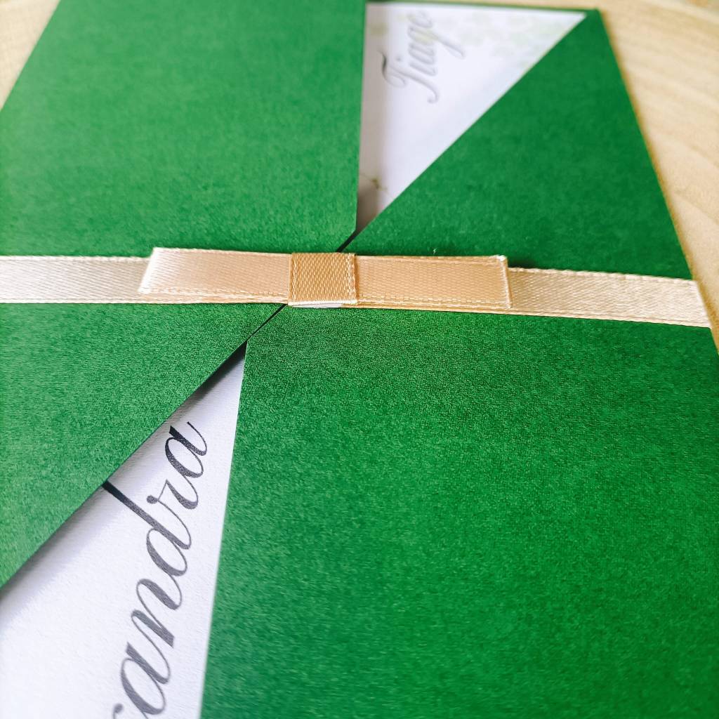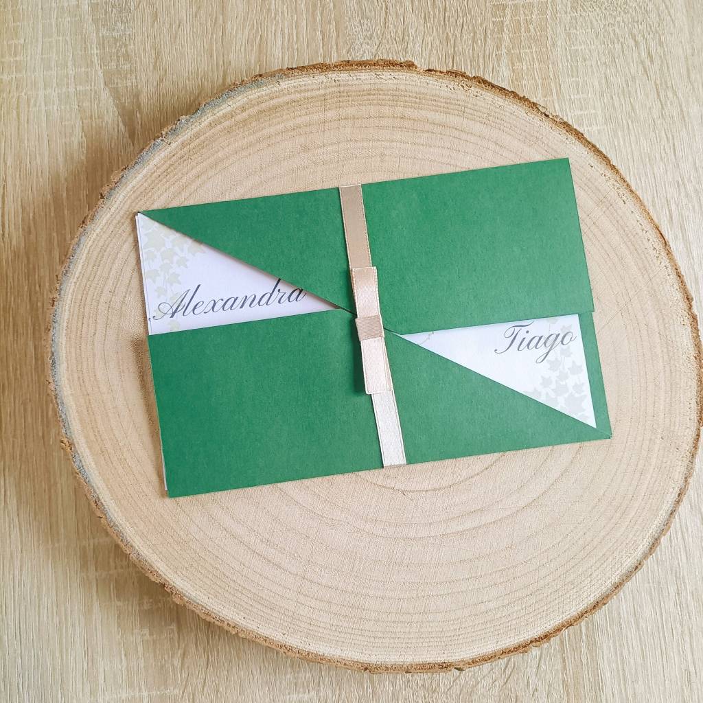 - Envelope : Um envelope com uma gramagem de 220gr, num tom verde floresta, com um fecho em formato de “V” cruzado que revela delicadamente o conteúdo interior.
