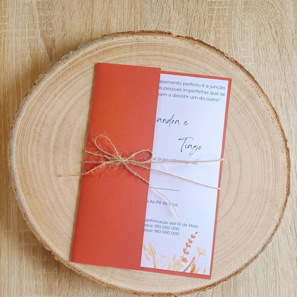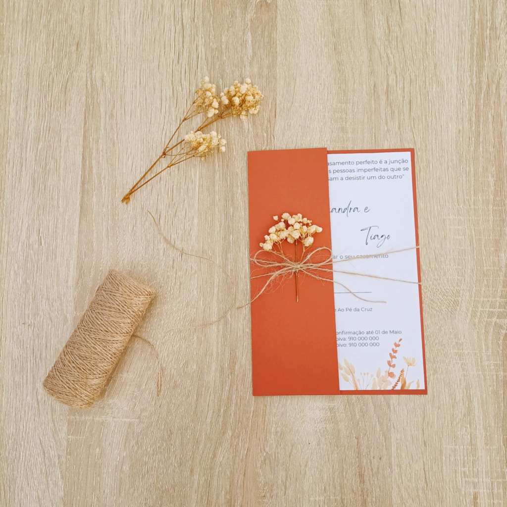 - Envelope: tom erracota de cor vibrante e quente, com um corte moderno que permite destacar a informação interior.
