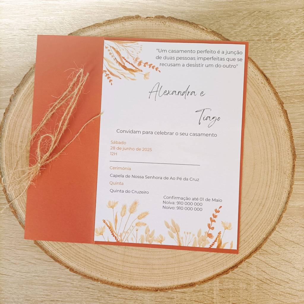 A elegância do rústico encontra a suavidade das flores preservadas. O Convite Romance de Outono foi desenhado para casais que sonham com uma celebração acolhedora e orgânica, onde cada detalhe evoca a beleza natural e a simplicidade sofisticada.