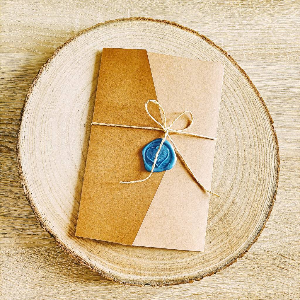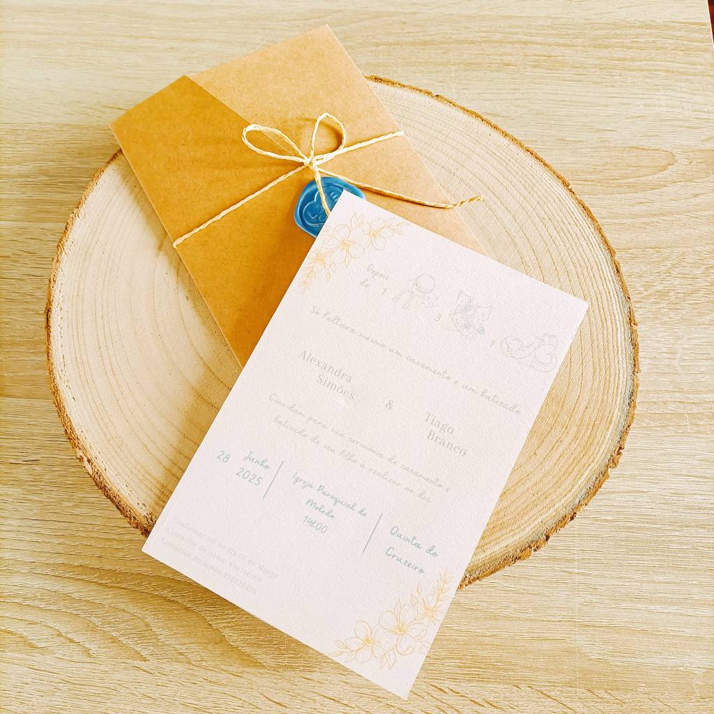 - Envelope: O envelope de aba cruzada em papel kraft confere um aspeto artesanal, rústico e intemporal, perfeito para eventos ao ar livre ou com uma decoração natural.