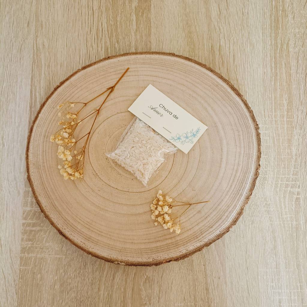 - O que inclui: Saquinho de celofane, arroz e cartão personalizado agrafado/colado.