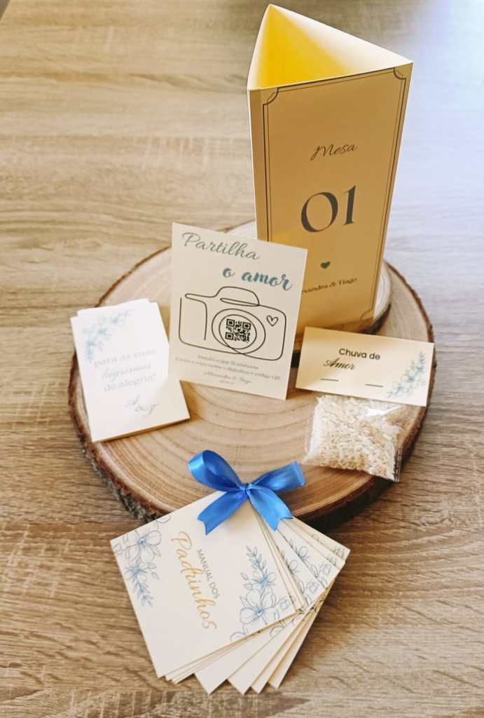 - Manual dos Padrinhos: Um guia afetivo em formato de mini-livro, unido por uma fita de cetim, para orientar e agradecer às pessoas mais importantes do vosso grande dia.