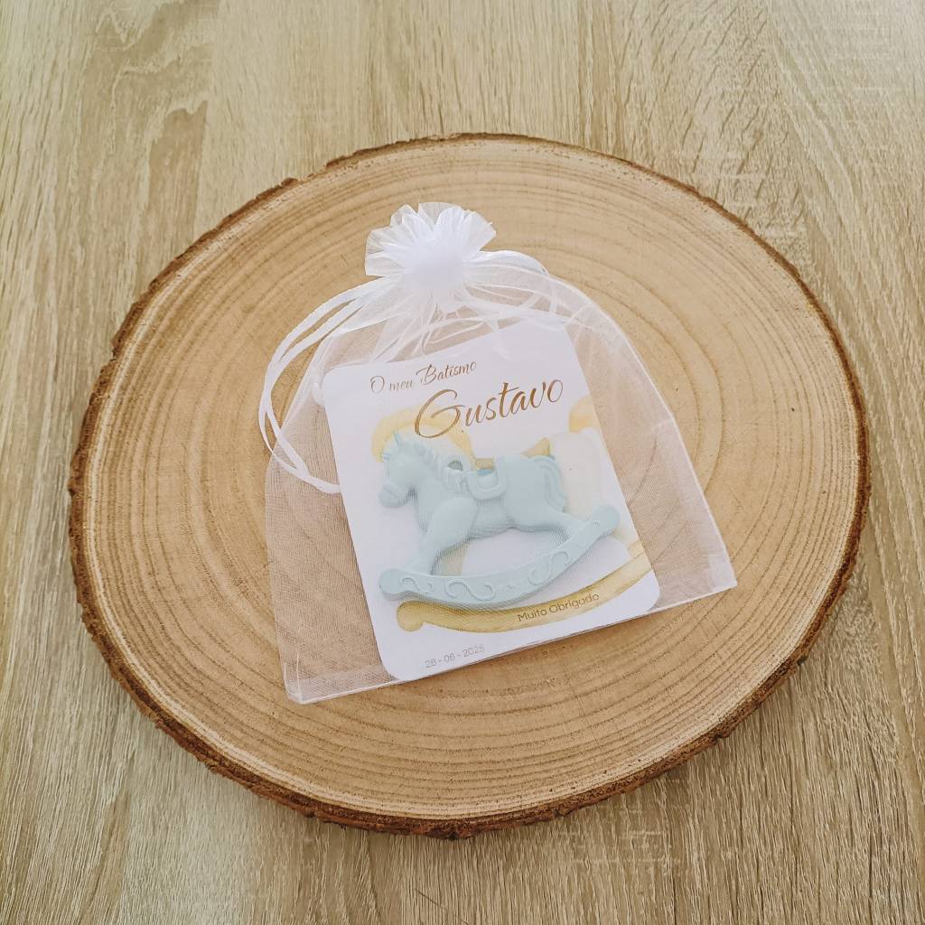 Há memórias que guardamos com o carinho de um brinquedo antigo. O nosso Cavalinho de Balanço é uma homenagem à pureza da infância: uma peça delicada em relevo, abraçada por um elegante saquinho de organza e um cartão personalizado com todo o amor.