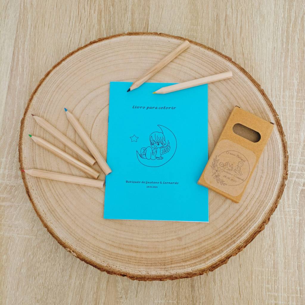 - Lápis de Cor: Inclui caixa de mini lápis de cor em cartão kraft, personalizada a condizer.